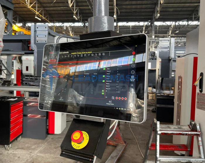 Самое современное ЧПУ DA-Touch создает следующий уровень эффективности программирования, работы и контроля листогибочных прессов. Продуманные алгоритмы управления упрощают процесс создания программ и минимизируют время настройки пресса. Управление ЧПУ осуществляется, главным образом, посредством сенсорного экрана. Кроме элементов сенсорного управления, на передней панели ЧПУ находится кнопка аварийного останова, маховик, кнопки пуска и останова.